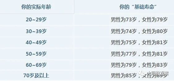 首先记下你的基础寿命,如下,如果你现在年龄在20-29岁之间,男性的基础寿命为73岁,女性为79岁,如果你现在的年龄在60~69岁之间,那么男性的基础寿命为79岁,女性为83岁,每道题在基础寿命上进行加减。