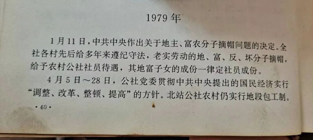 1979年1月11日,中共中央作出关于地主、富农分子摘帽问题的决定。全社各村先后给多年来遵纪守法,老实劳动的地、富、反、坏分子摘帽,给予农村公社社员待遇,其地富子女成份一律定社员成份。