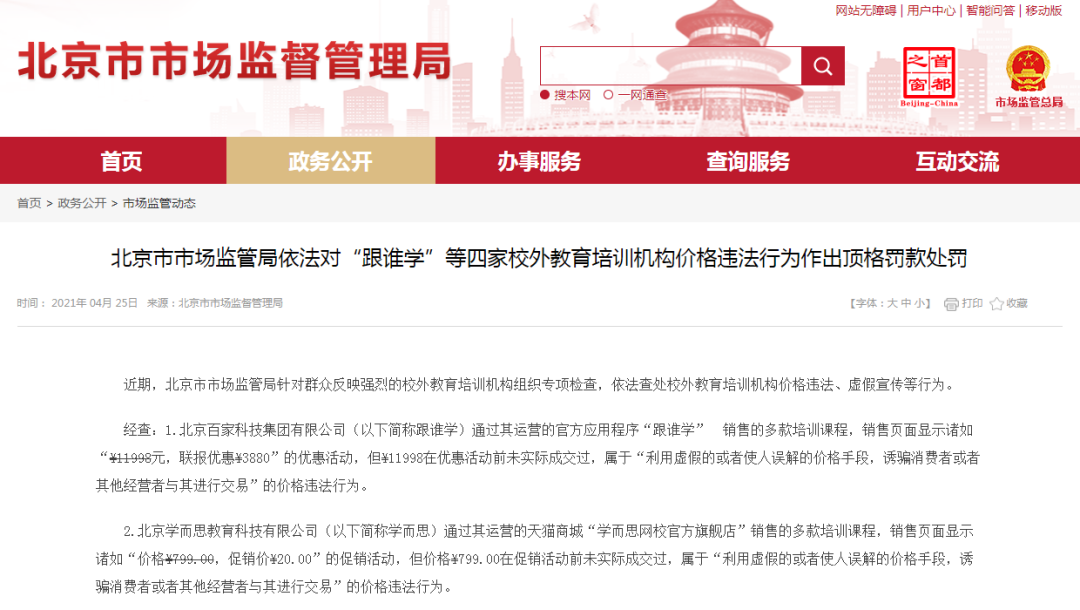 北京市市场监管局依法对“跟谁学”等四家校外教育培训机构价格违法行为作出顶格罚款处罚
