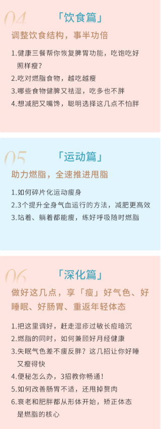 专业中医大夫根据你的体质特点,有针对性地从饮食、运动、睡眠、体态等各个方面入手,抓住减脂的每个关键环节,破除多种瘦身误区,减脂塑形强身一步到位,全程指导你每天怎么吃着瘦、怎么动着瘦、怎么睡着瘦,帮助你燃脂不反弹。