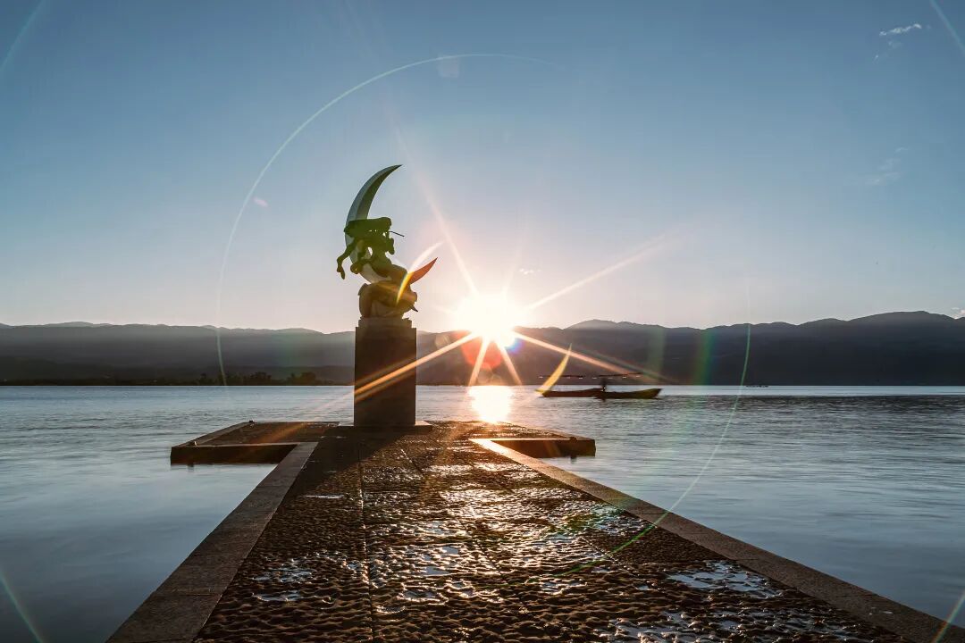 泸山脚下的月色风情小镇也在南岸,镇上那座少女雕塑,引得很多人来合影留念。