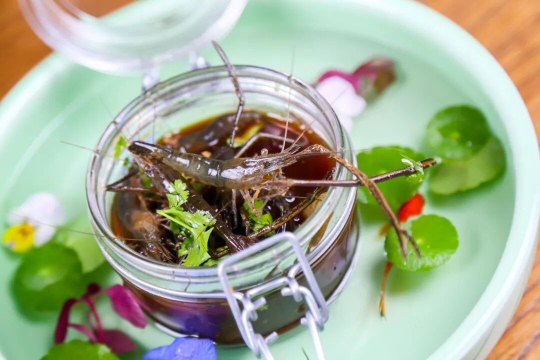 将活的小虾清洗干净后直接埋入加满佐料的白酒中,让虾在酒中慢慢醉倒。