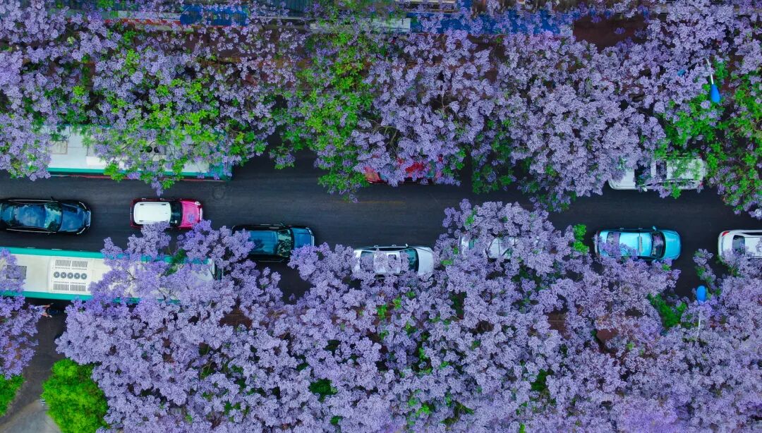 不论是“中国最美加油站”还是停在街道旁的车,都因为这烂漫的蓝花楹而有了一份别样的浪漫色彩。