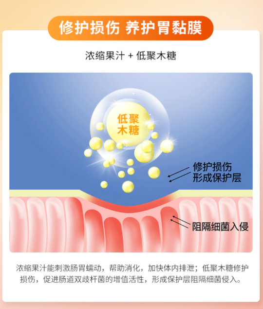 低聚木糖 浓缩果汁能促进肠道双歧杆菌增值活性,帮助胃部伤口愈合的同时平衡肠道益生菌,增强胃部免疫力,快速舒缓胃部不适。