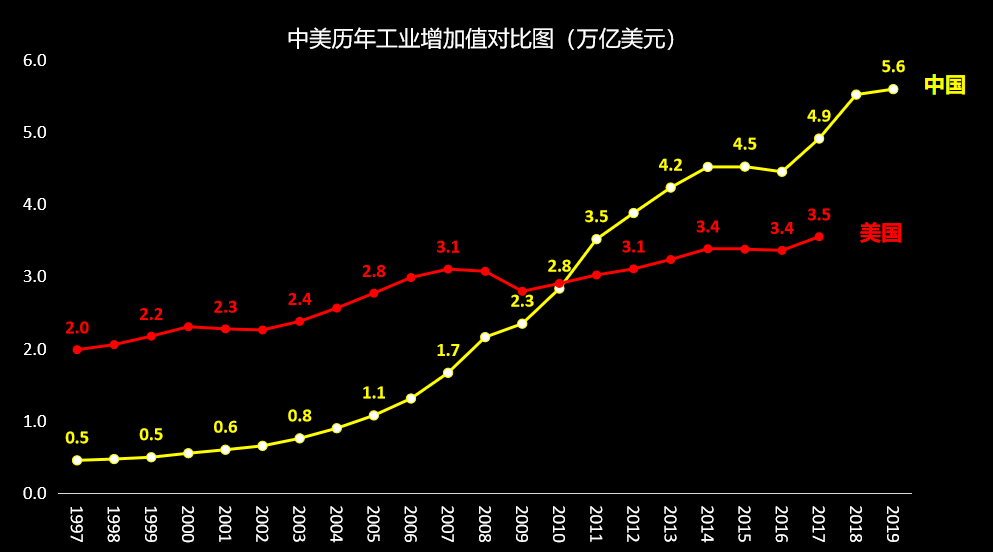 比如,我们的工业增加值在2010年的时候超过了美国,2017年的时候是美国的1.4倍。但是,最近两年美国没有向世界银行公布其数据。