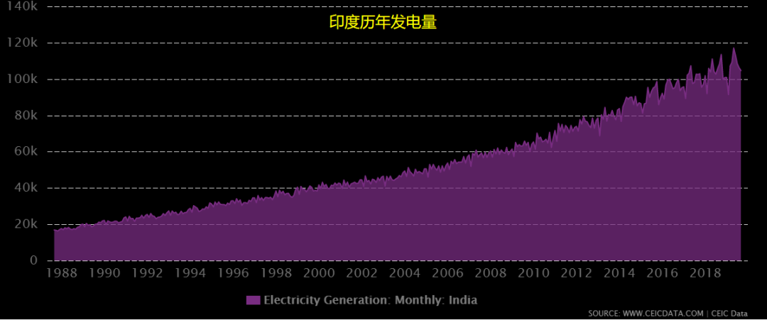 比如,我们在网络上查不到印度的工业GDP,但是我们可以从印度的发电量来估算:2019年,中国的月度发电量大概为520K吉瓦时,印度的仅为100K吉瓦时,这就说明印度的工业GDP只有我们的五分之一不到。