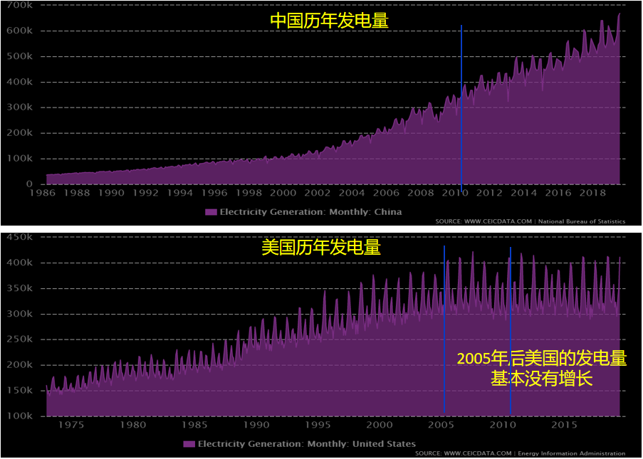 大家看看下面的中美发电量的图,从这个图中我们可以清楚的看出以下几点:
