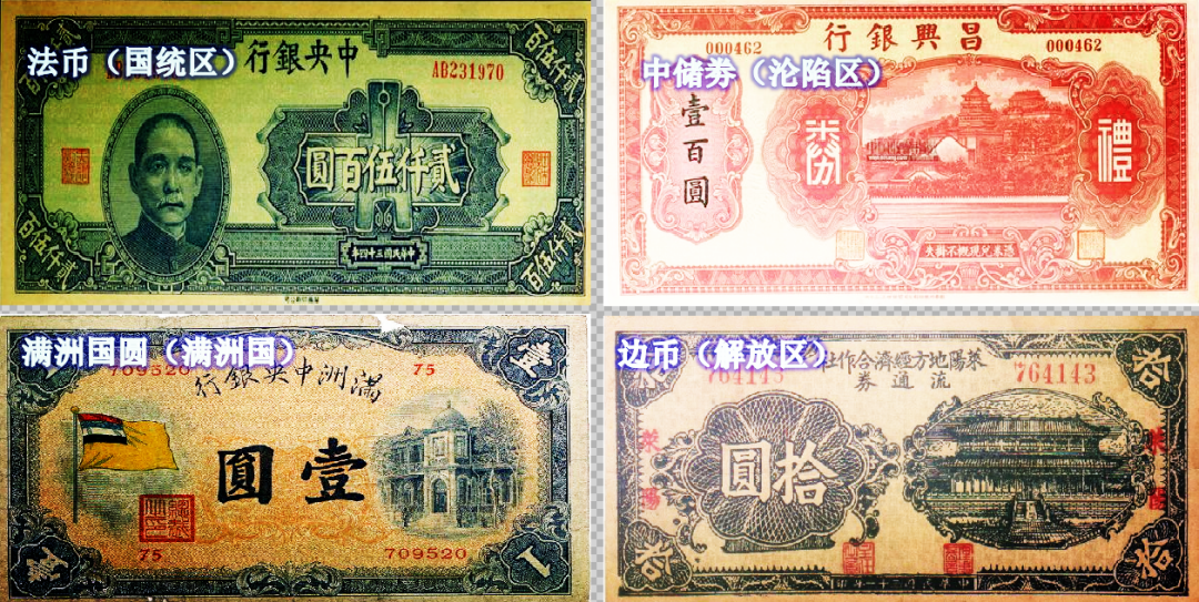 比如,在抗日战争时期,国民党统治的区域(老蒋)主要使用法币,沦陷区(汪伪政府)主要使用中储劵,伪满洲国(日本的傀儡)主要使用满洲国圆,解放区主要使用边币。