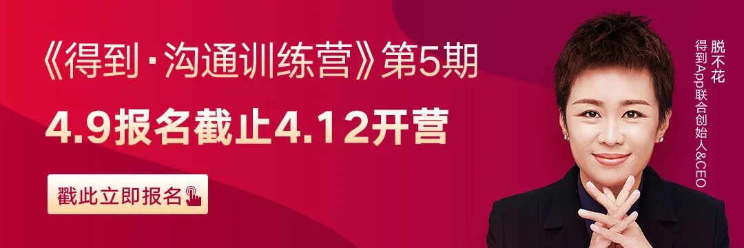 为你推荐由得到App联合创始人 & CEO脱不花主讲的《得到·30天沟通训练营》。这不是一门教你能说会道的沟通课,而是一门教你能在职场中解决问题的沟通训练营。沟通能力,只能练习。它像游泳、骑自行车一样,一旦习得,你就能掌握,永不退转。欢迎你的加入。