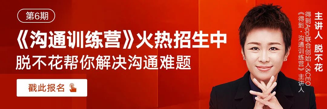 为你推荐由得到App联合创始人 & CEO脱不花亲自讲授和示范的《得到·沟通训练营(第6期)》。这不是一门教你能说会道的沟通课,而是一个教你用沟通解决问题的训练营,真学真练。沟通能力一旦习得,永不退转。5月24日正式开营,欢迎你的加入。
