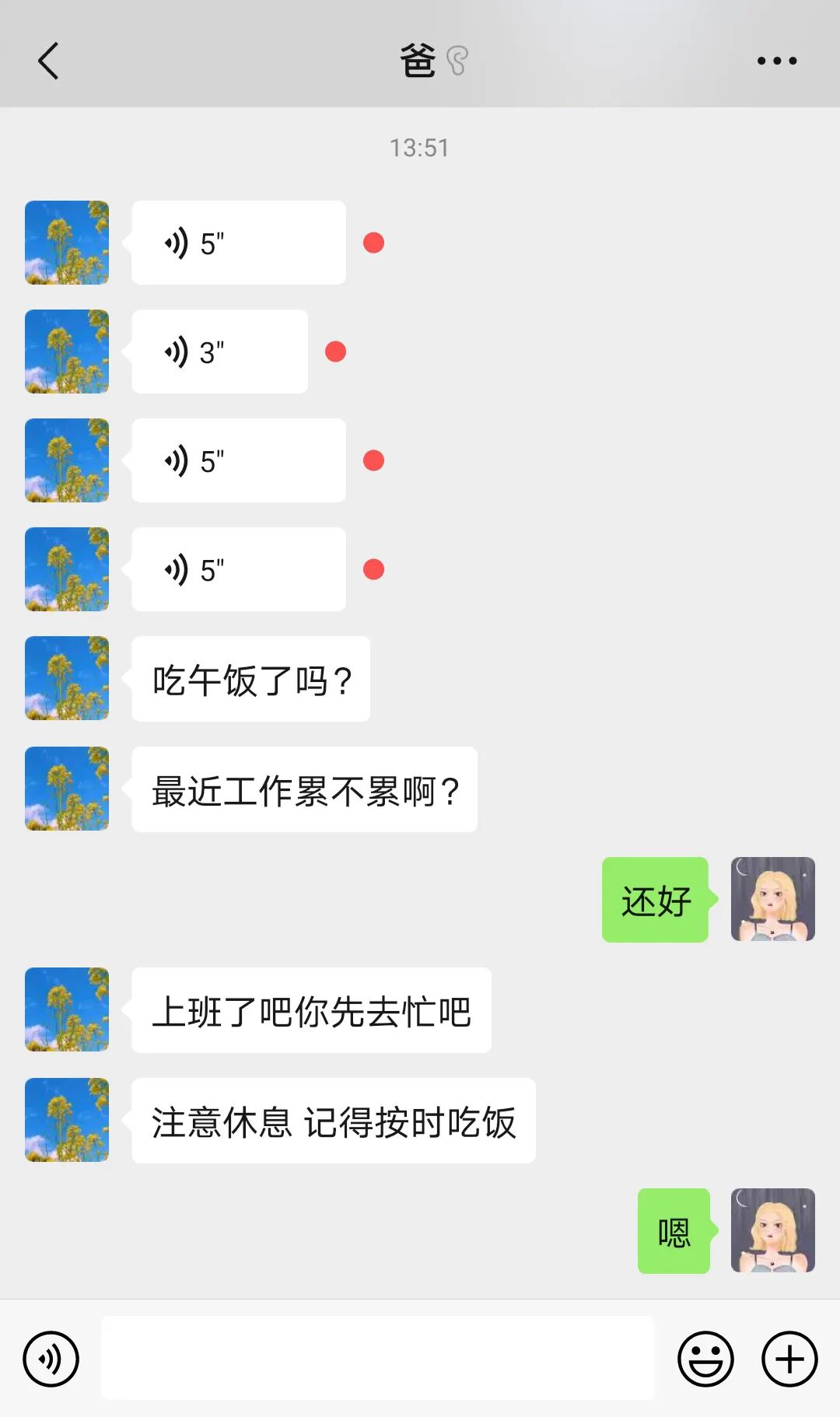 疫情好转后,换了份工作,每天都在拼命加班,争取尽快适应新环境,很多时候不能及时回复父母的微信。