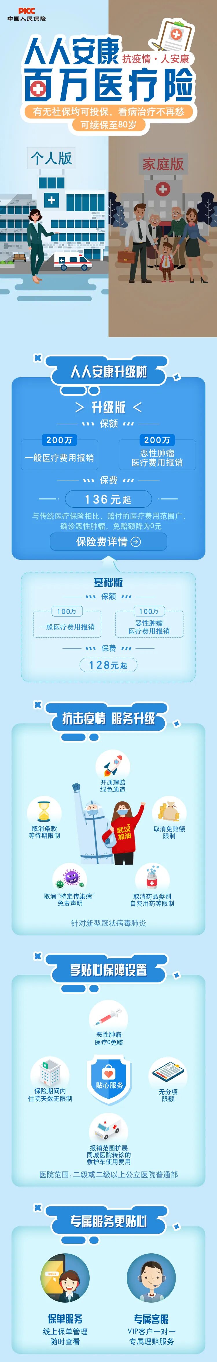 疫情期间,针对感染新型冠状病毒肺炎的出险客户,特开通理赔绿色通道,取消条款等待限制,取消“特定传染病”免责限制,取消免赔额限制,取消药品类别、自费用药等限制。人人安康客户还可享受一次性全程导医导诊、一次性国内专家二次诊断、住院费用垫付、心理测评等众多增值服务,贴心守护健康。