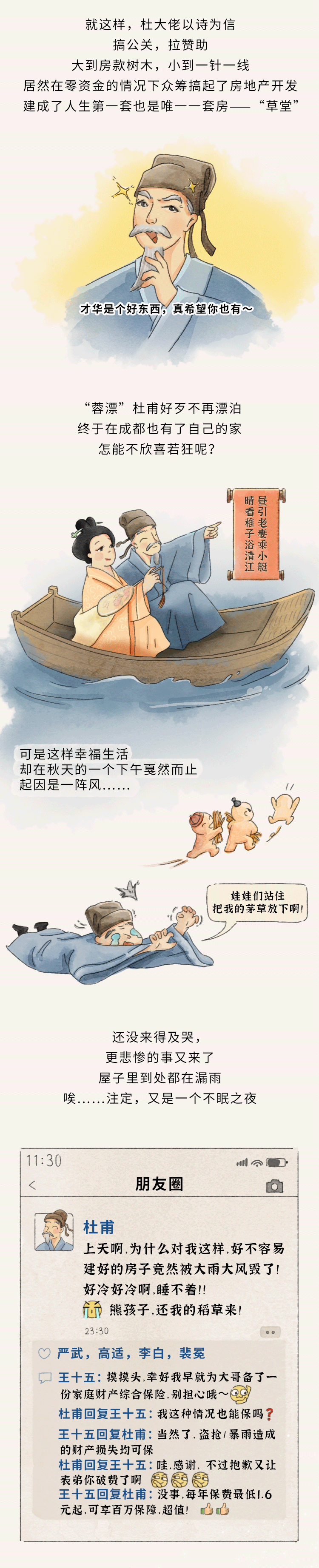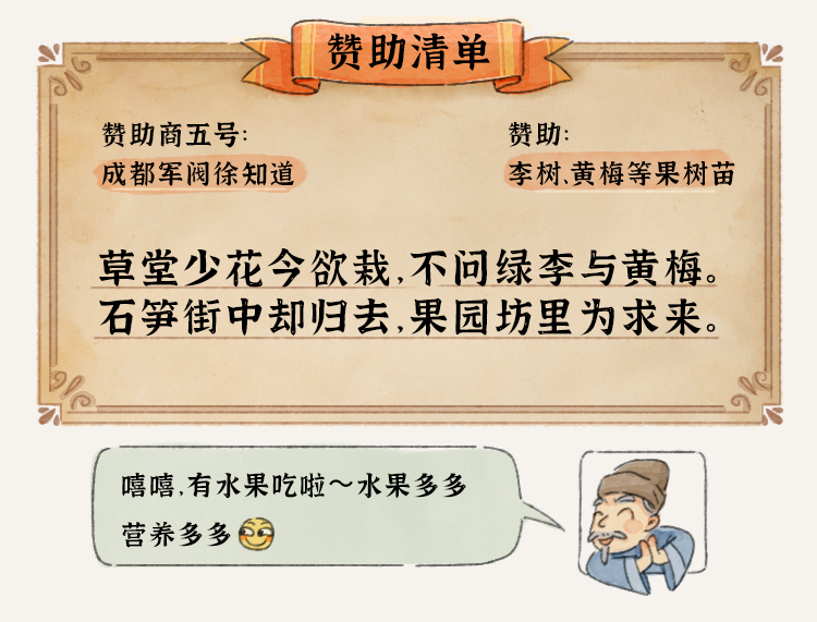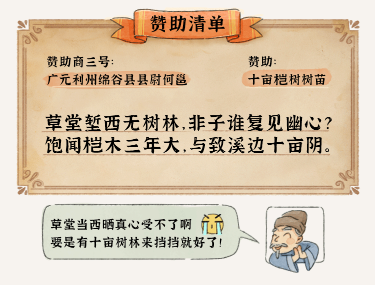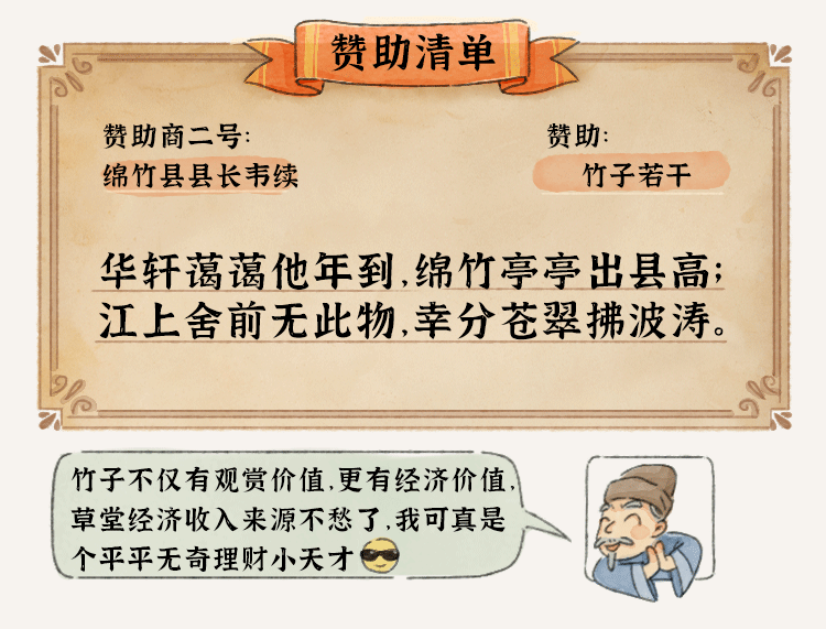 杜甫《王十五司马弟出郭相访兼遗营草堂资》《因崔五侍御寄高彭州一绝》《萧八明府实处觅桃栽 》《从韦二明府续处觅绵竹 》《凭何十一少府邕觅桤木栽》《又于韦处乞大邑瓷碗》《诣徐卿觅果栽》《进艇》《茅屋为秋风所破歌》