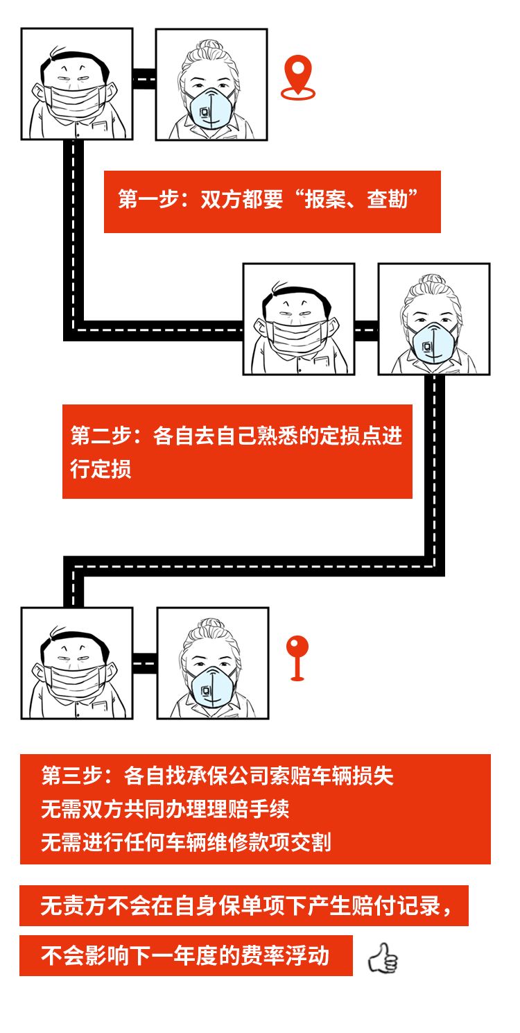 在经查勘人员现场查勘后,事故双方可在全责方保险责任范围内各自定损、修车、办理索赔。无需报交警、无需事故证明,无需双方共同办理理赔手续。无责方客户可以向自己的承保公司索赔,不上浮保费。