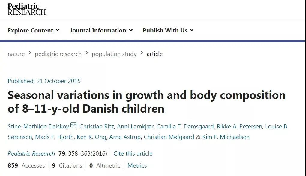 期刊杂志《自然·儿科研究》上,刊登了一篇名为《8岁至11岁丹麦儿童身高及体质的季节性变化》(Seasonal variations in growth and body composition of 8–11-y-old Danish children)的论文。