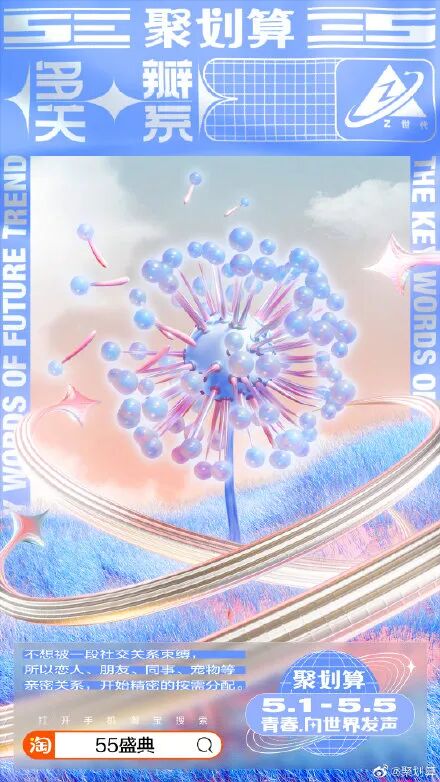 由聚划算z世代青春趋势词可以看出,当代青年人,要精致生活,也要精打细算;保持亲密关系,又从不丢失自我;两代人间的鸿沟不再硬碰硬,而是互相启发……通过这些解读,更完整的展现这一代青年真实面貌。
