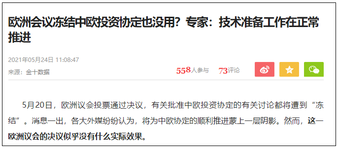 事实上,大家也看到了,自从拜登上台后,欧盟确实对中国非常不友好,不仅仅在香港、新疆、疫情等问题上和美国一起对中国发难,而且冻结了已经谈了35轮、历时7年的《中欧直接投资协议》……