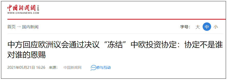 欧盟冻结《中欧直接投资协议》就是想要以此威胁中国,要加强对欧盟的支持;中国发动反击就是要告诉欧盟,不要太过分了,否则别怪我不客气!