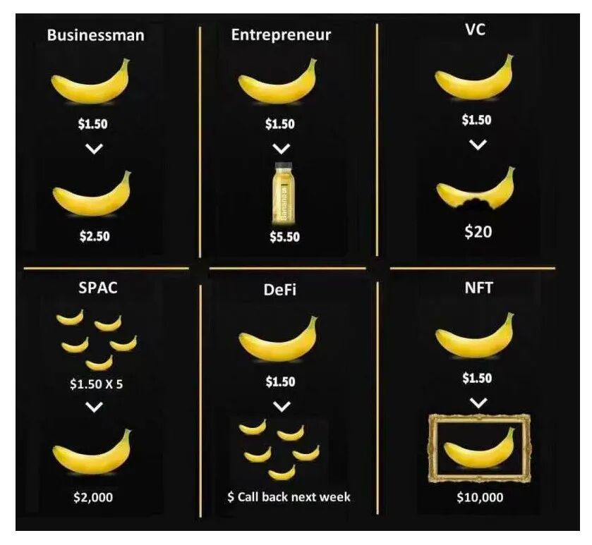 ▲一根1.5美元的香蕉在商店能赚1美元,经过VC的包装能卖到20美元,在NFT玩家手里能炒到1万美元