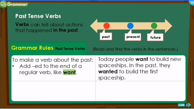 其次,鲸鱼的教学内容也非常有挑战性。比如在鲸鱼G1级别的课上会教一个语法知识点:动词过去式。