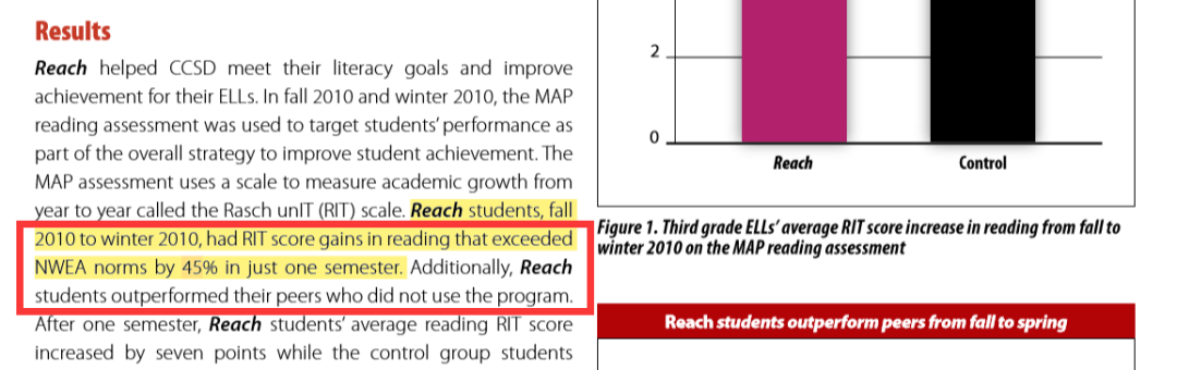 用Reach教材的学生的阅读成绩要比用非Reach教材的学生高45%。