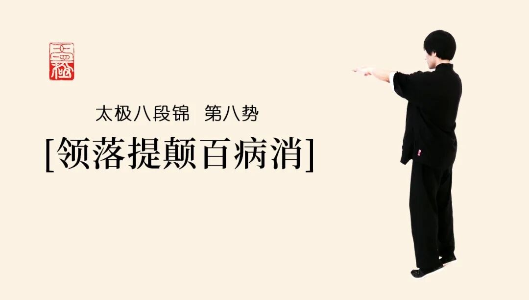 第八势:此势含有太极的颠劲,掌握此颠劲能很好地抖动身体的大龙——脊柱,带来全身内外的放松,并防止后脑被震伤。