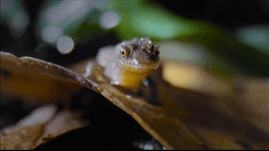 为了等待壁虎喷射粘液的画面,制作组可以常年蹲守野外积累素材。使用高精度的运动镜头,才捕捉到这样的精彩瞬间: