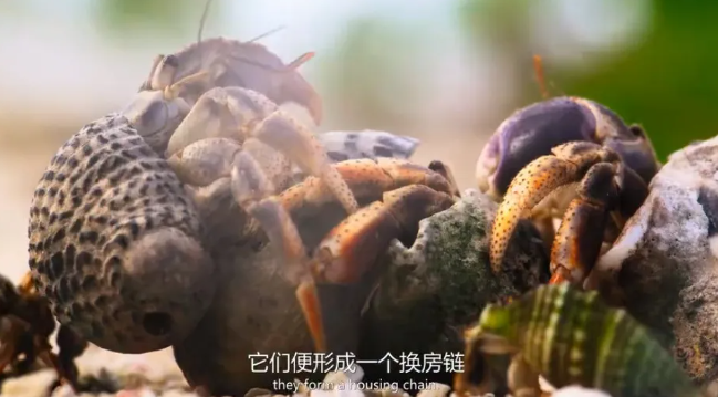 寄居蟹们慢慢长大,需要定期更新“新家”。他们往往成群结队,按照体型大小互相交换“二手房”,简直是选房跳蚤市场。