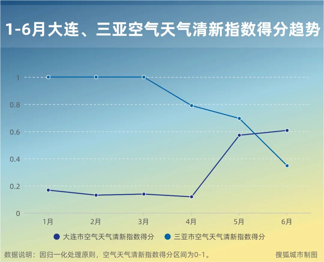 以大连和三亚1-6月的空气天气清新指数得分为例,一季度处于寒冷冬季的大连人体舒适度较低,因而空气天气清新指数得分均处于0.2之下;而同期温暖如春的三亚,则连续3个月空气天气清新指数在336座地级及以上城市中排名第一,获得最高分1分。