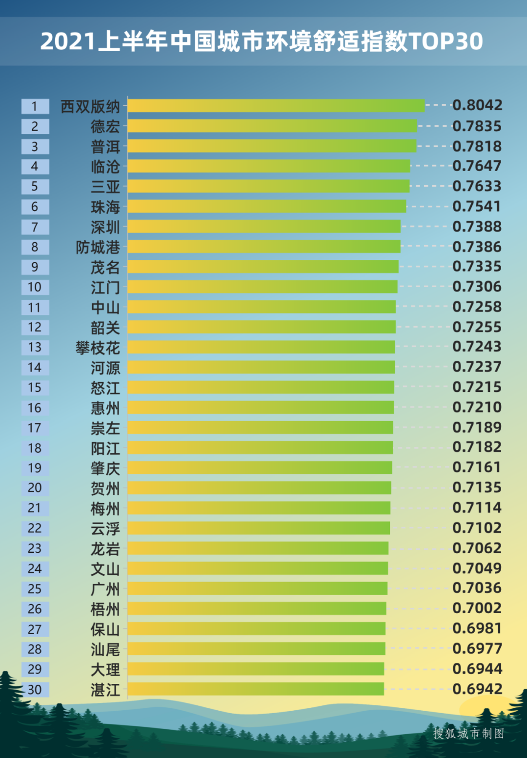 2021上半年中国城市环境舒适指数TOP30/搜狐城市制图