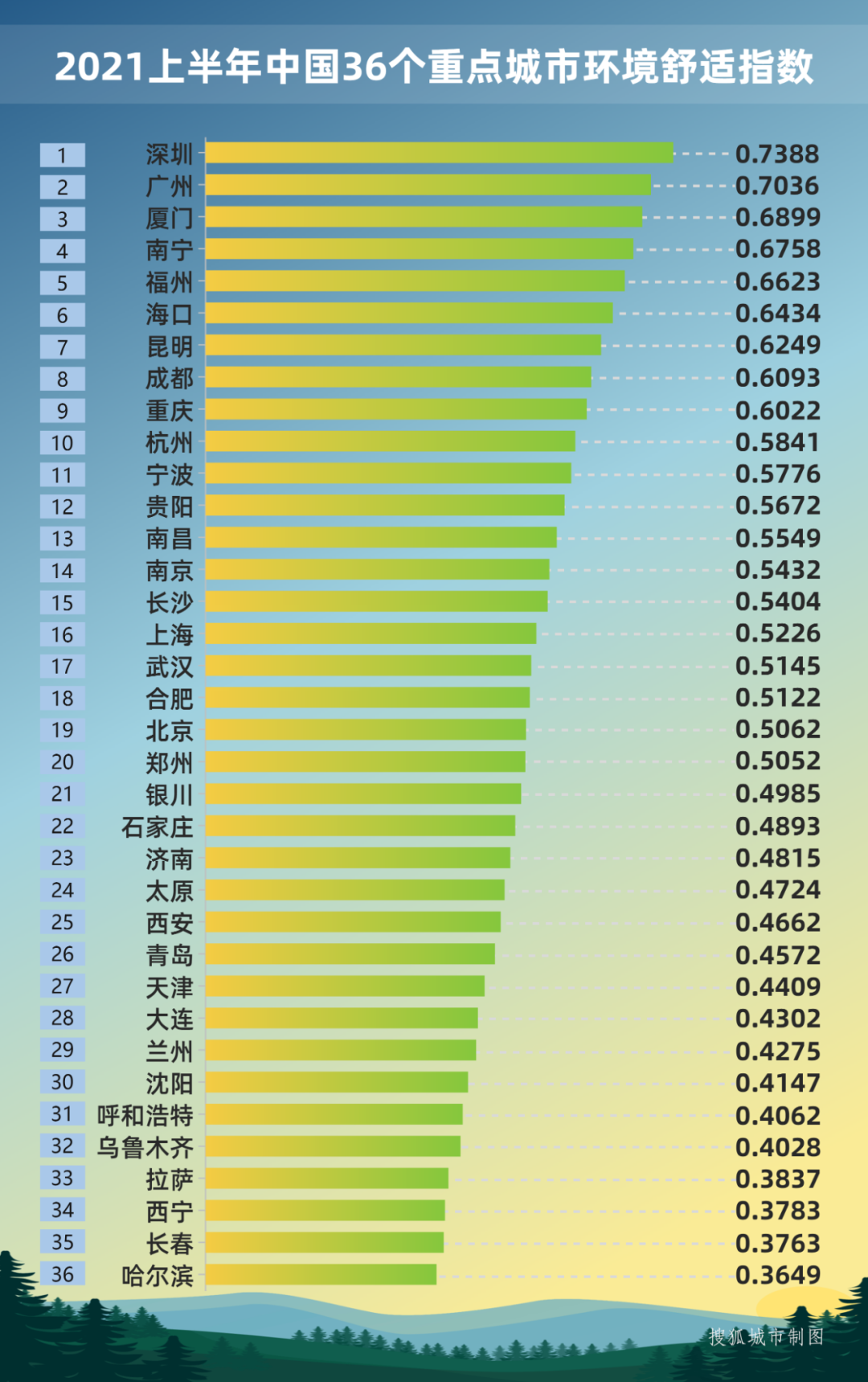 2021上半年中国36个重点城市环境舒适指数/搜狐城市制图