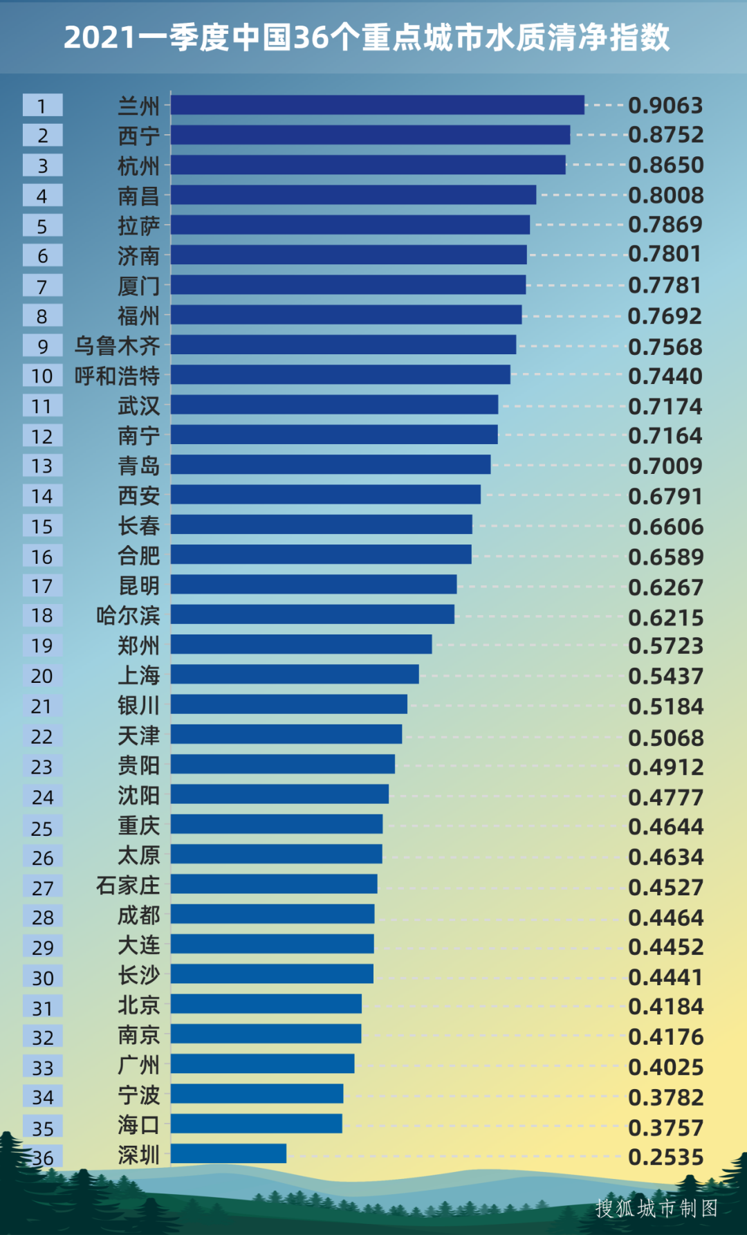 2021一季度中国36个重点城市水质清净指数/搜狐城市制图