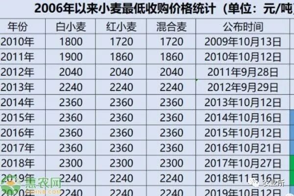 根据数据可知,2010年白小麦最低收购价格为1800元/吨,红小麦最低收购价格为1720元/吨,混合麦最低收购价格为1720元/吨,小麦保护价在0.86-0.9元/斤;而2011年小麦保护价在0.93-0.95元/斤,2012年小麦保护价在1.02元/斤,2013年小麦保护价在1.12元/斤,2014-2017年小麦保护价在1.18元/斤,2018年小麦保护价在1.15元/斤,2019-2020小麦保护价在1.12元/斤,而2021年小麦保护价是1.13元/斤。