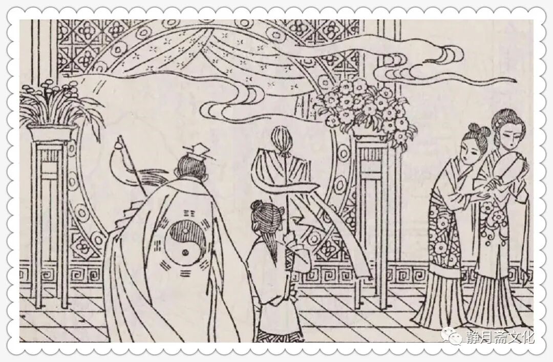 夜里,谢吉被家人关起来,不准和那狐仙见面,道士就在院子里开坛做法,一阵舞剑念咒,看得谢家人甚是紧张。