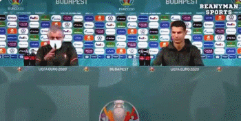 可口可乐是欧洲杯官方赞助商,他们在新闻发布会上展出了该产品。在对阵匈牙利的赛前新闻发布会上,葡萄牙球星C罗(克里斯蒂亚诺·罗纳尔多)落座后把桌上摆放的两瓶可乐移走,放到了镜头外。然后,举起面前的矿泉水说:“要喝水,不要可乐。”提醒大家喝水更健康!