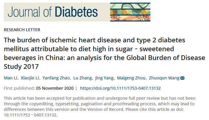 ④Li M,Li X, et al. The burden of ischemic heart disease and type 2 diabetes mellitus attributable to diet high in sugar-sweetened beverages in China: an analysis for the Global Burden of Disease Study 2017. J Diabetes. 2020 Nov 5.