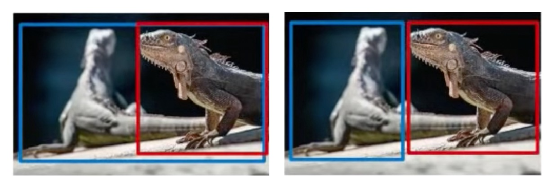 这是一幅来自 ImageNet 的图像。标注指令是 "使用边界框来表示鬣蜥的位置",这个指令乍听起来不难理解。然而,一位标注者在绘制标签时,没有让边界框重叠,并且忽略了尾巴。与此相反,第二位标注者考虑了左边鬣蜥的尾巴。
