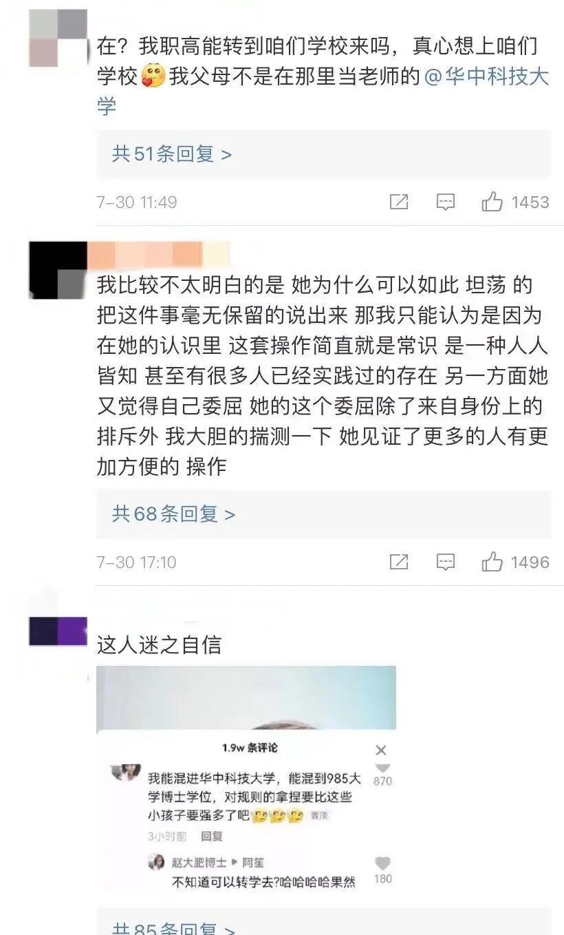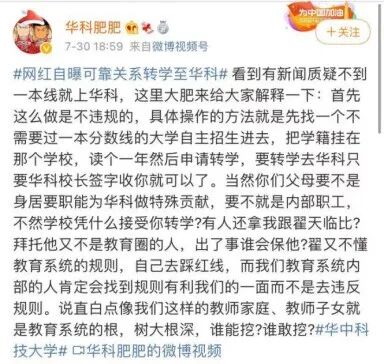 这一番言论在网络上迅速发酵,微博话题#网红自曝可靠关系转学至华科#热度飞涨,华中科技大学也被推上热搜。