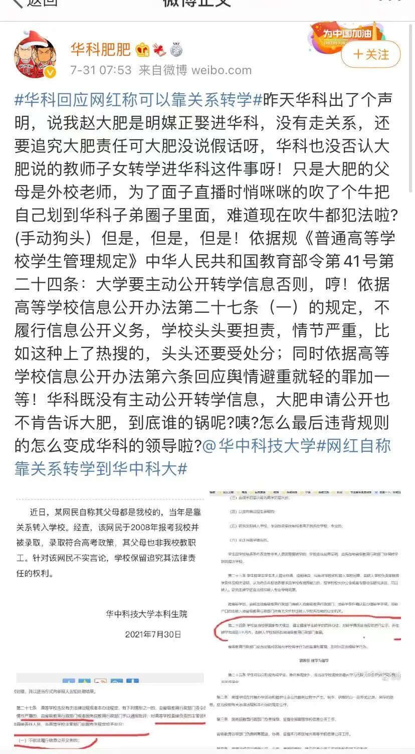 7月30日华中科技大学发布最新回应:回应中表示该网红是通过正常报考流程以正常分数考入华科,其父母并非华科教职工。全文对2008年转学事件只字未提。