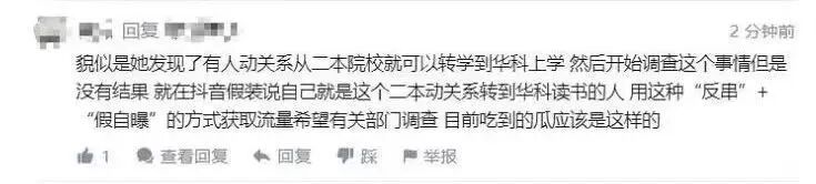 文中该网红称自己只是夸大了说法,父母并非华科老师。并质问此次事件中最为关键的问题:华科为什么不公开转学信息?为什么拒绝个人提出的查看转学信息的要求?