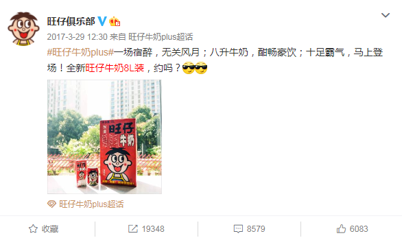 临近愚人节,旺旺在微博宣布推出“旺仔牛奶 8L 装”,并陆续晒出 8L产品海报和超市售卖的照片。破格的包装迎合了愚人节“搞大事”的气氛,借势节日热度活动微博话题#旺仔牛奶plus#阅读量超3000万。