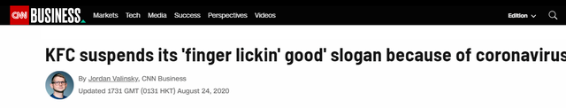 与此同时,肯德基还发起了抑制新型冠病毒传播的全球性活动,该活动于8月24日启动。活动期间,肯德基还专门在YouTube上发布了一段视频,并在视频中将“吮指回味”的相关标语打上了马赛克。
