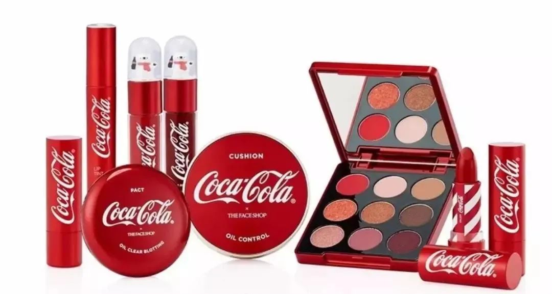 早前,可口可乐与韩国彩妆品牌The Face Shop联名,推出了一套由内而外可乐风十足的全系列彩妆。联名款包括9色眼影盘、气垫BB、粉饼、唇膏、唇釉和染唇液六个品类,产品都采用了可口可乐经典的包装设计和logo。