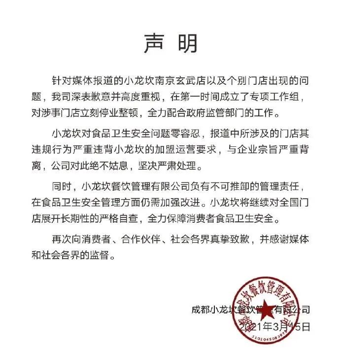 一边是“315”时期的严格监管,一边是消费者被激发的不满情绪,二者之叠加给了小龙坎莫大的压力。就在事件曝光后不久,小龙坎总部便发布了致歉声明回应此事。