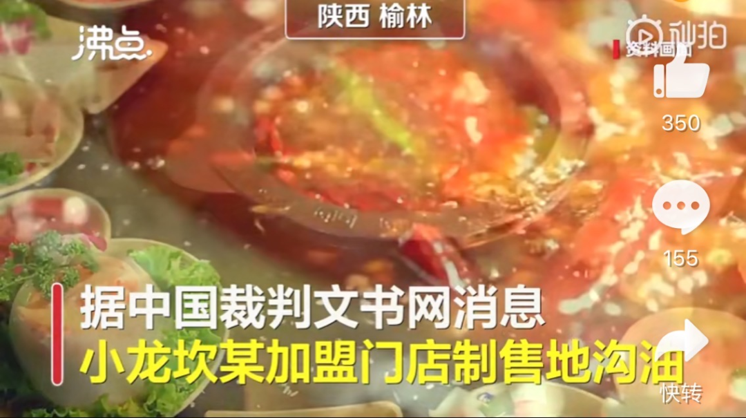据此前媒体报道,事情缘于不久前中国裁判文书网的一纸判决书。陕西省榆林市榆阳区人民法院的一则刑事判决书显示,火锅品牌小龙坎在榆林一家加盟门店两年间销售给顾客用“地沟油”制成的火锅锅底超2吨。