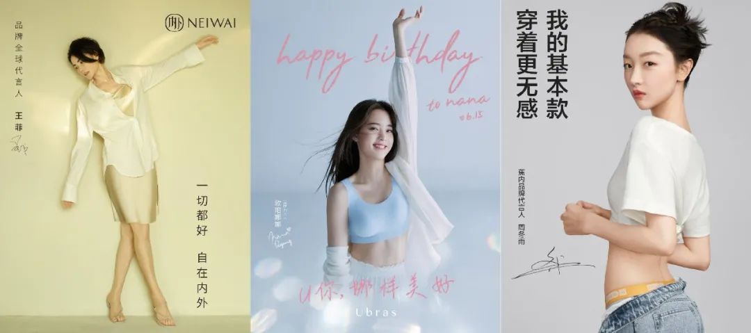 这些品牌的代言人,也不再是以性感著称的女明星。内外的代言人王菲,是随性的,优雅的,独特的;ubras的代言人欧阳娜娜,是元气的,活力的,时尚的;蕉内的代言人周冬雨,是灵动的,清新的,独具魅力的。