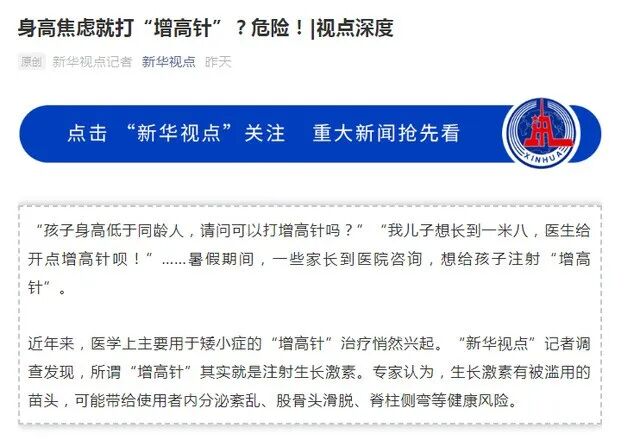 8月4日晚间,新华社发文,直指当下生长激素有被滥用的苗头,可能带给使用者内分泌紊乱、股骨头滑脱、脊柱侧弯等健康风险。