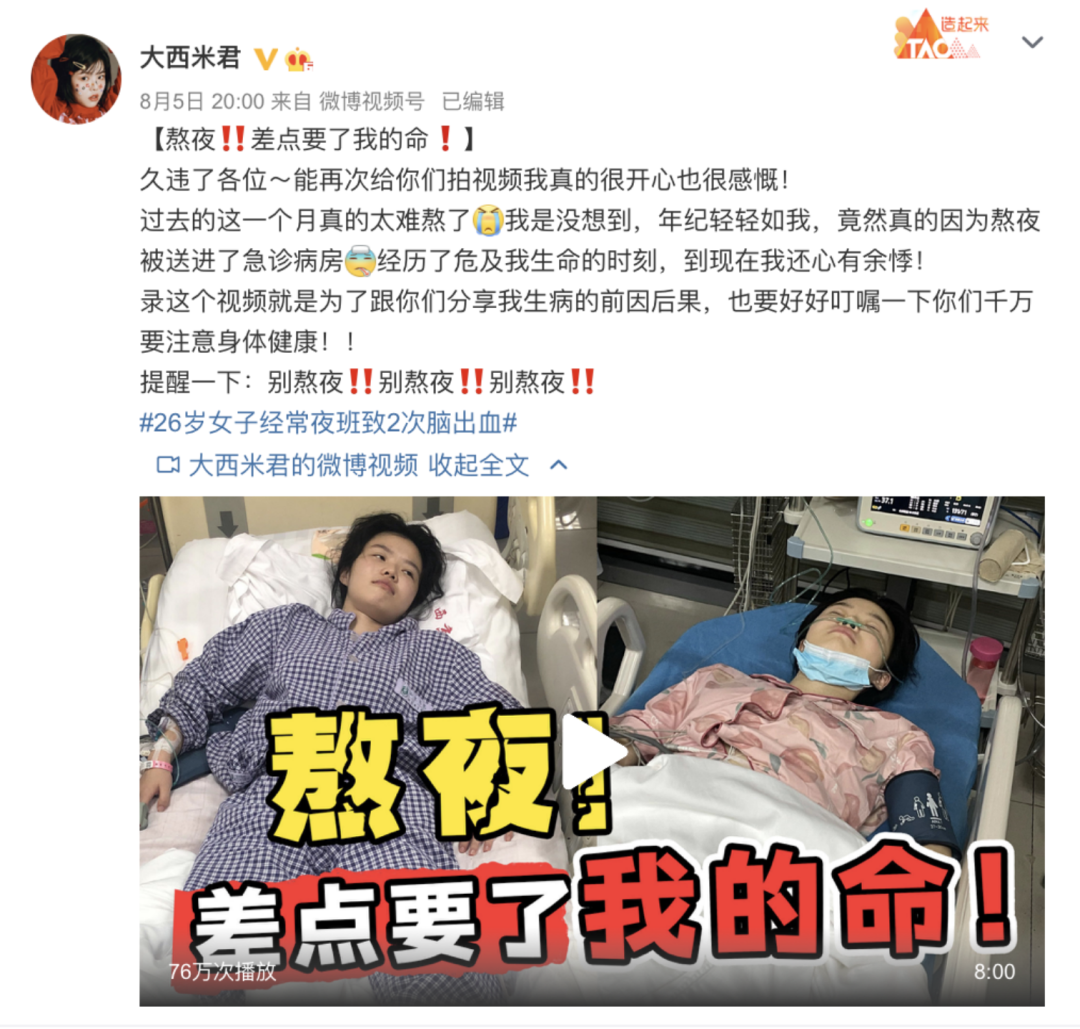 8月5号,网友“大西米君”则分享了自己熬夜导致血液感染休克的案例。在熬了一个通宵后,她去了一家小诊所就医,随后出现发冷、晕厥等症状,患了血脓毒症。医生说,主要是睡眠过少、免疫力低,加上去了非正规诊所造成血液细菌感染,差一点送了命。
