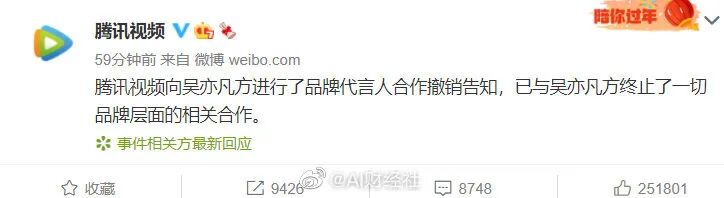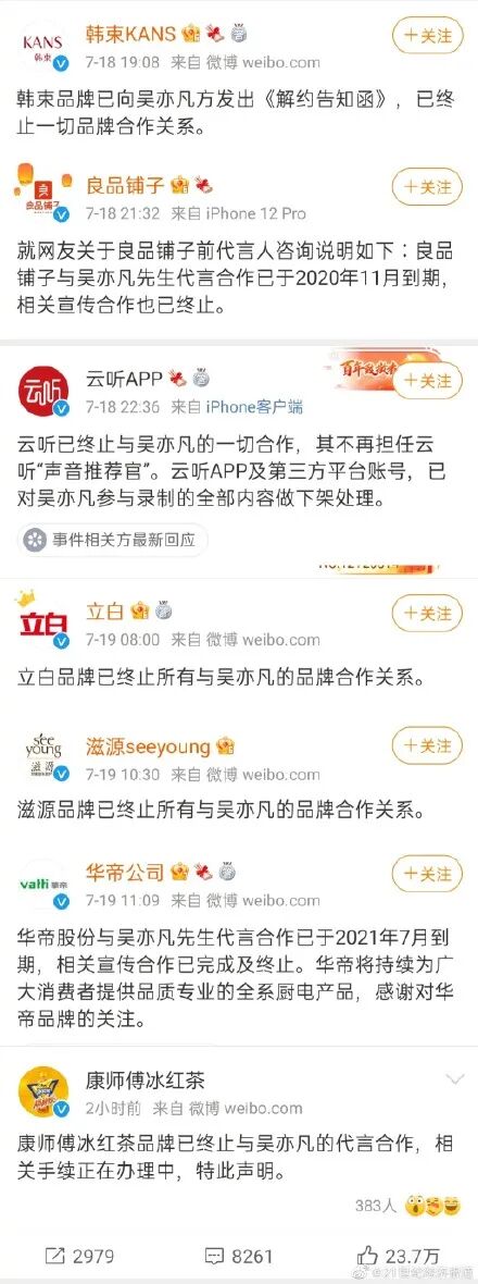 截至目前,韩束、良品铺子、云听APP、立白、滋源、华帝、康师傅冰红茶、得宝、腾讯视频等品牌都终止了与吴亦凡的代言合作。