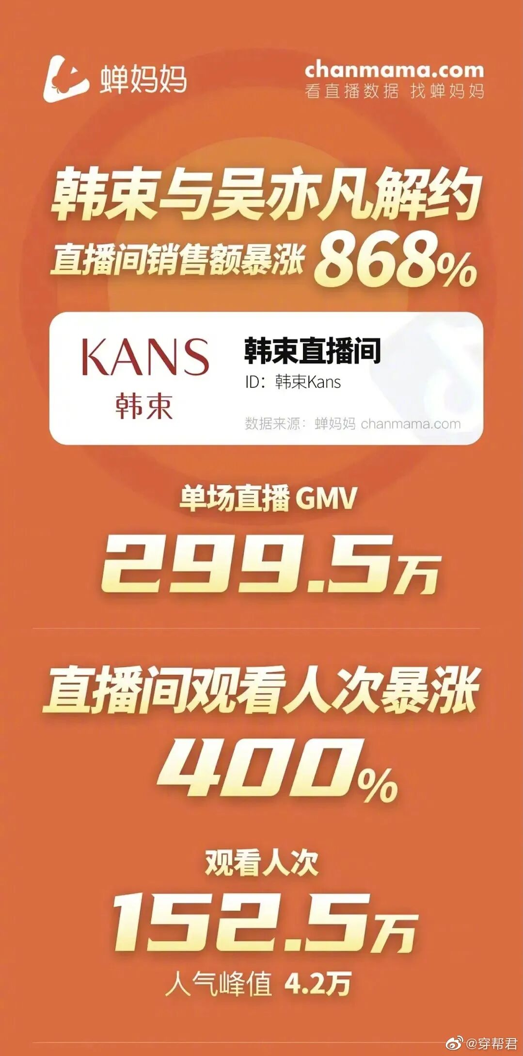 有数据显示,在宣布与吴亦凡解约后,韩束直播间的销售额暴涨868%。再加上直播间外#韩束直播间##韩束与吴亦凡#等话题发酵,反应迅速、判断准确的韩束,无疑是这场舆论中的最大赢家。